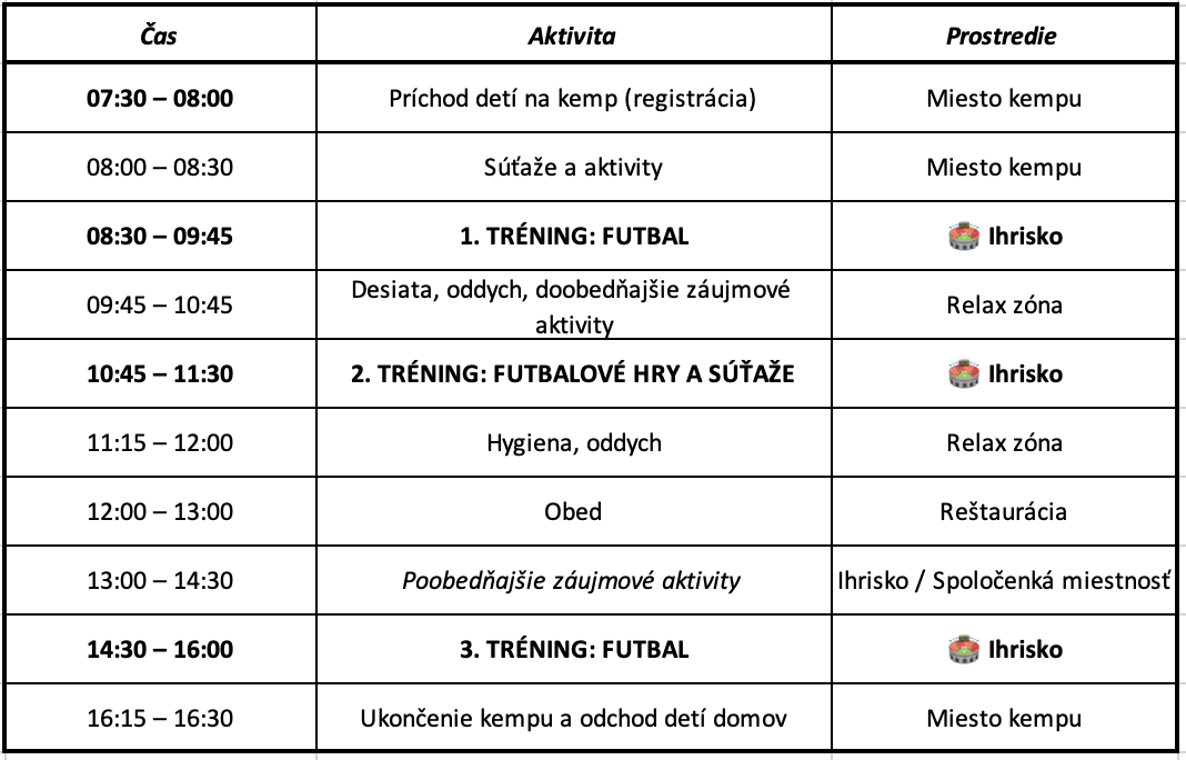 ⚽ FUTBALOVÝ KEMP (ročníky 2013 – 2020): Zameraný na technický progres a rozvoj herného myslenia. Ideálny pre hráčov, ktorí sa chcú pod vedením odborníkov výrazne zlepšiť v ovládaní lopty, technike a užiť si týždeň v profesionálnom areáli s novými spoluhráčmi.