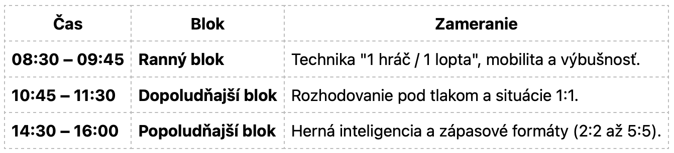 Náročnosť: Intenzita prispôsobená nárokom vrcholového mládežníckeho futbalu.